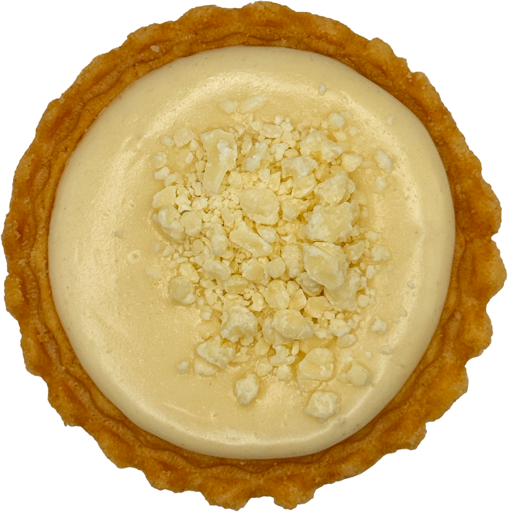Klassische Butter-Mürbeteigtart - gefüllt mit mit Cato Creme im Geschmack Weisse Schokolade - getoppt mit Weisse Schokoladen Crumbs